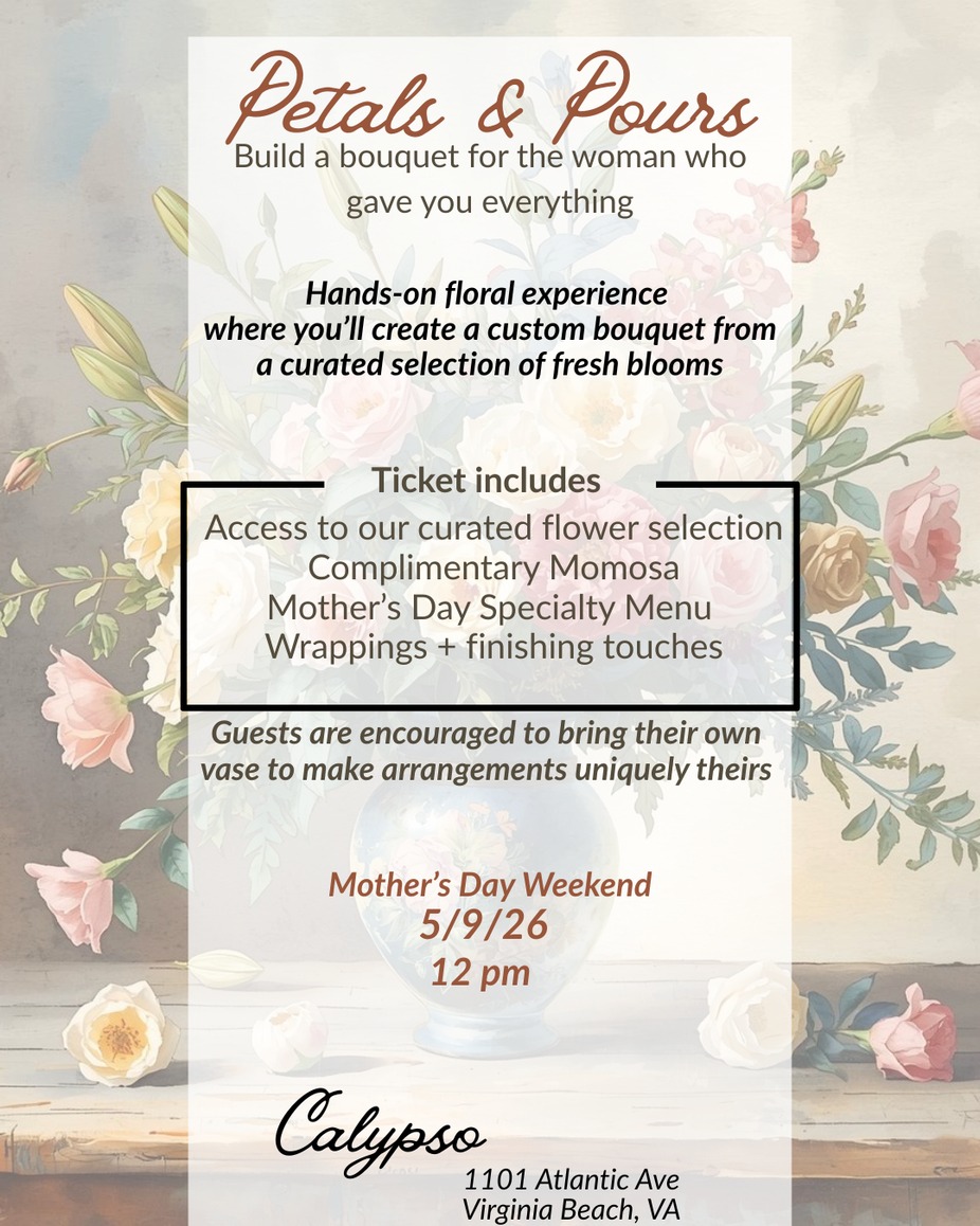 Tickets include premium stems, a complimentary Momosa, and everything needed to bring Mom's arrangement to life
